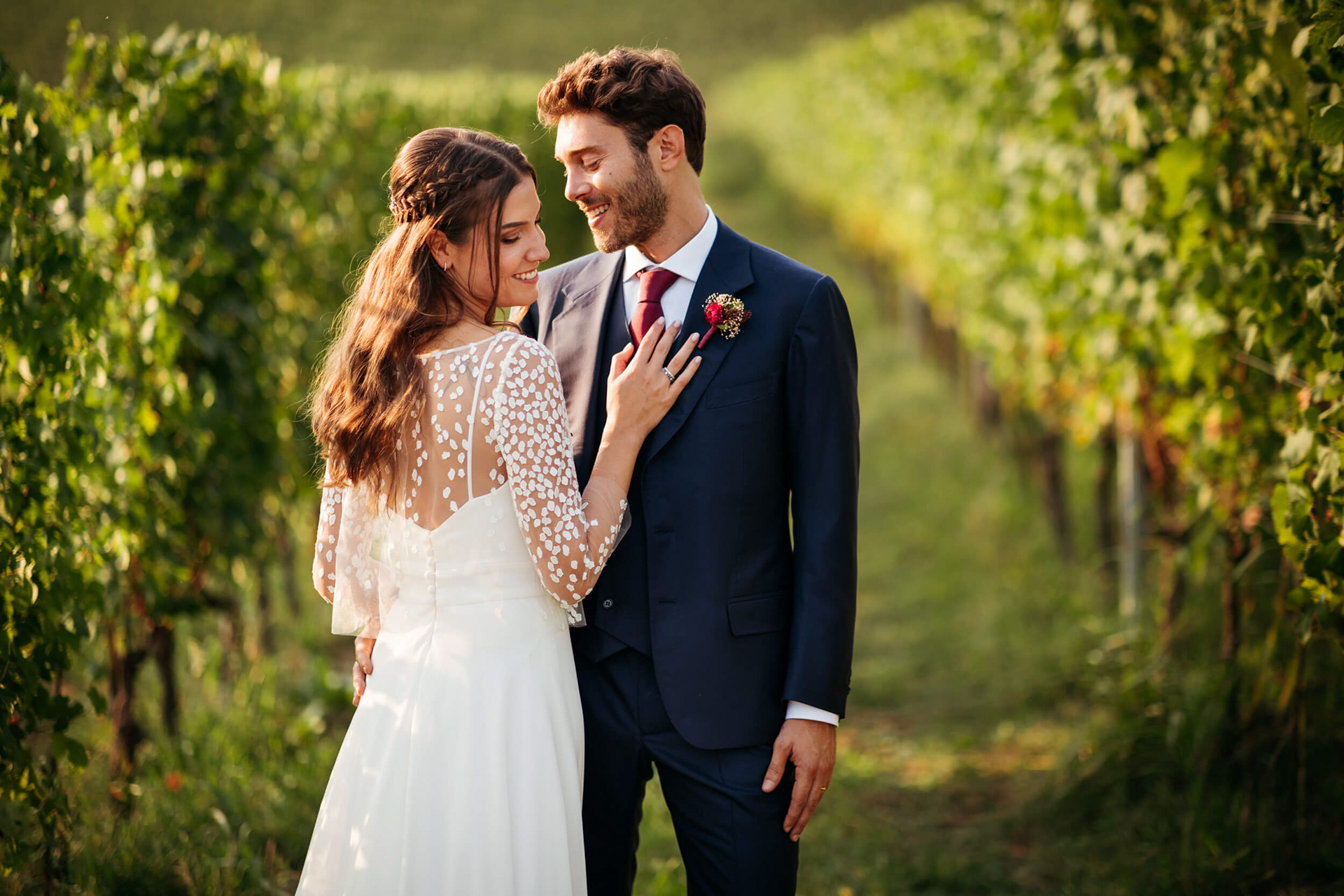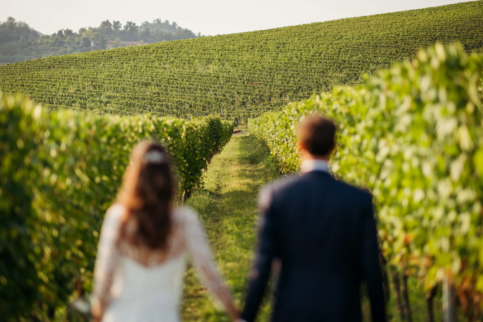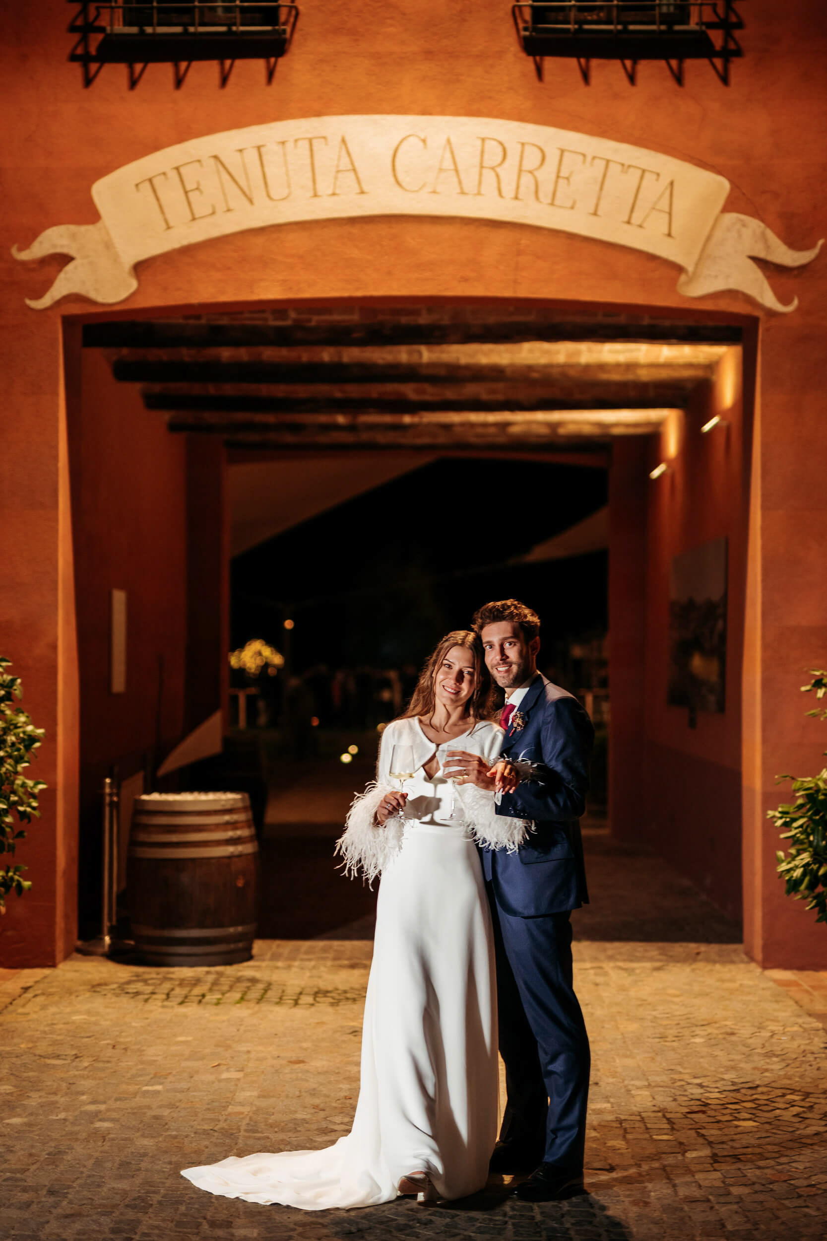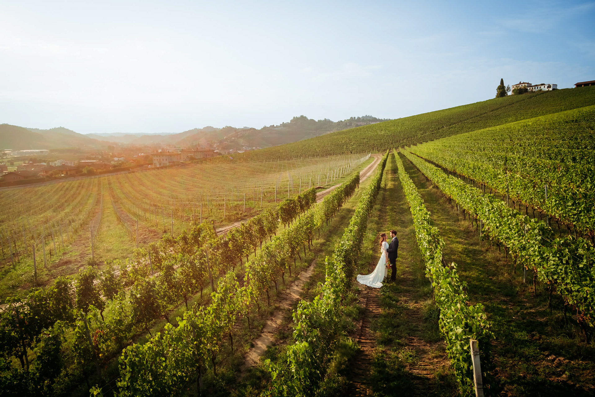 Dopo la cerimonia, la giornata è proseguita alla Tenuta Carretta, nelle Langhe, tra ritratti e passeggiate tra le vigne, mentre la luce del tramonto scendeva lentamente sul paesaggio.