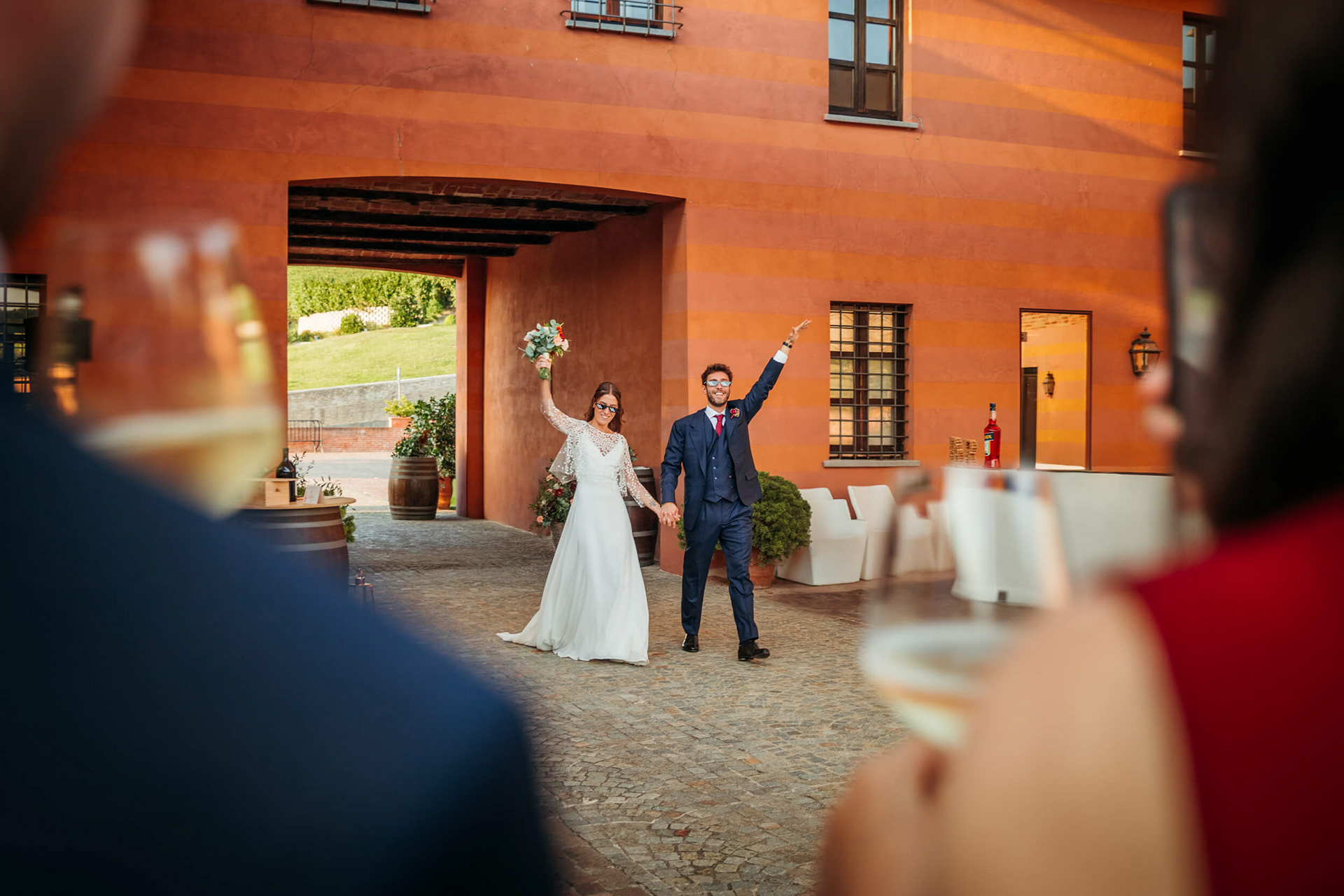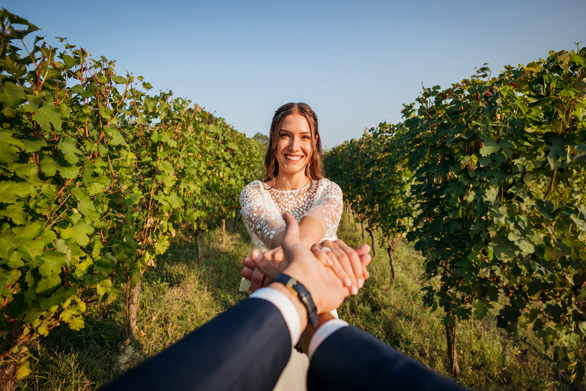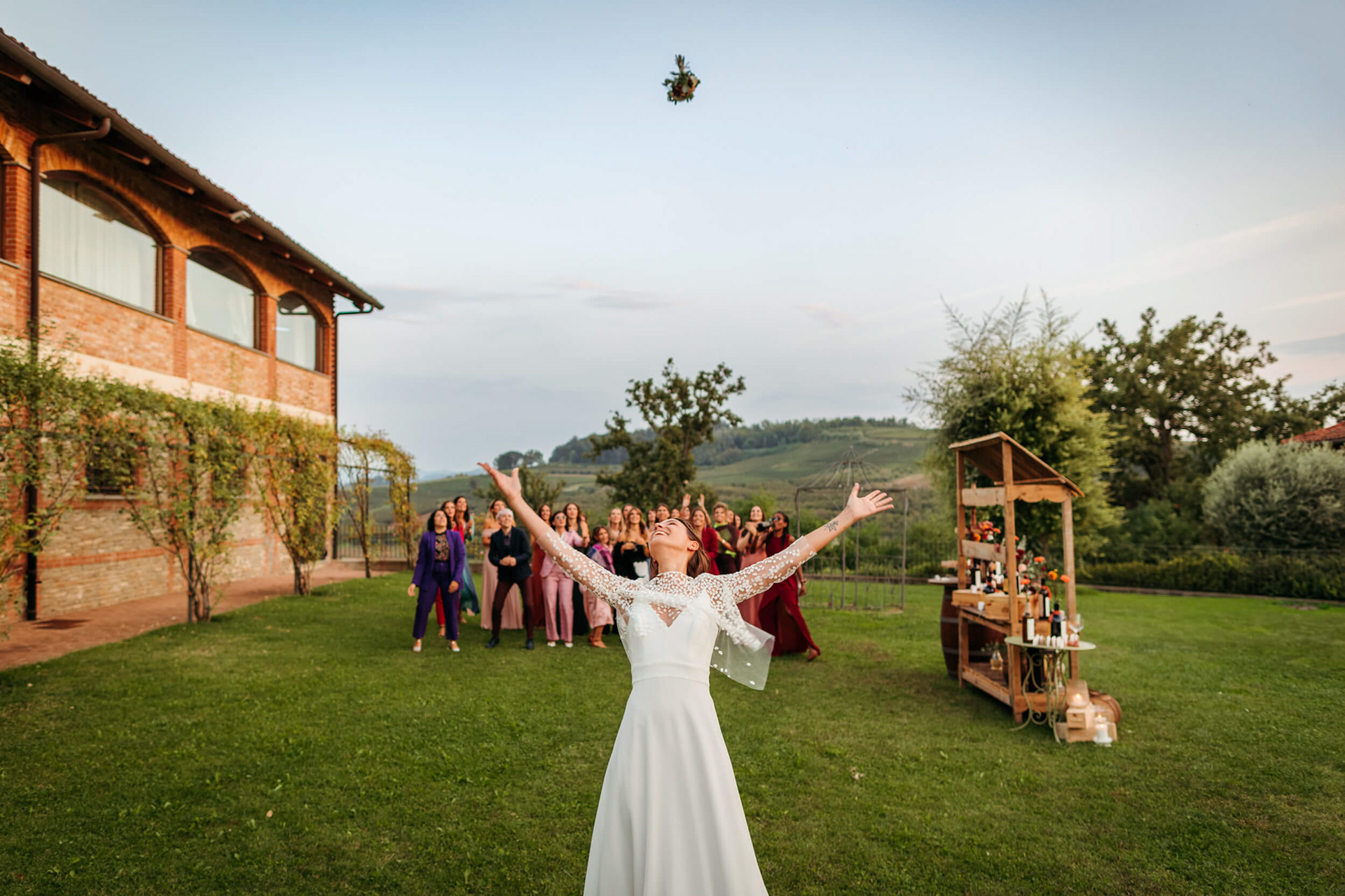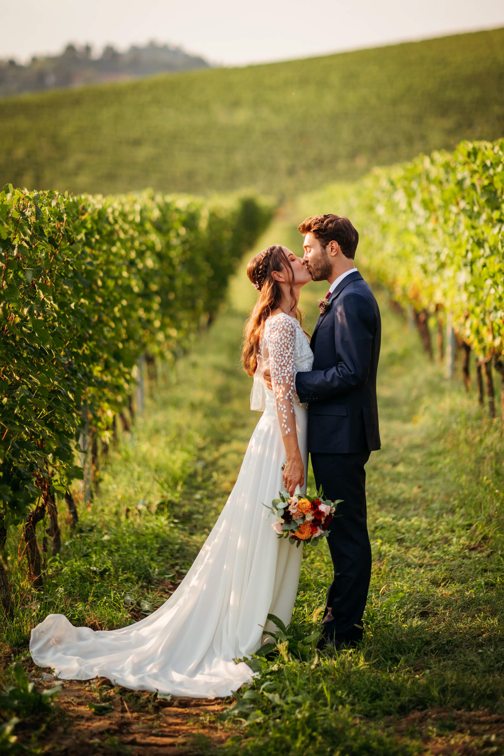 Dopo la cerimonia, la giornata è proseguita alla Tenuta Carretta, nelle Langhe, tra ritratti e passeggiate tra le vigne, mentre la luce del tramonto scendeva lentamente sul paesaggio.