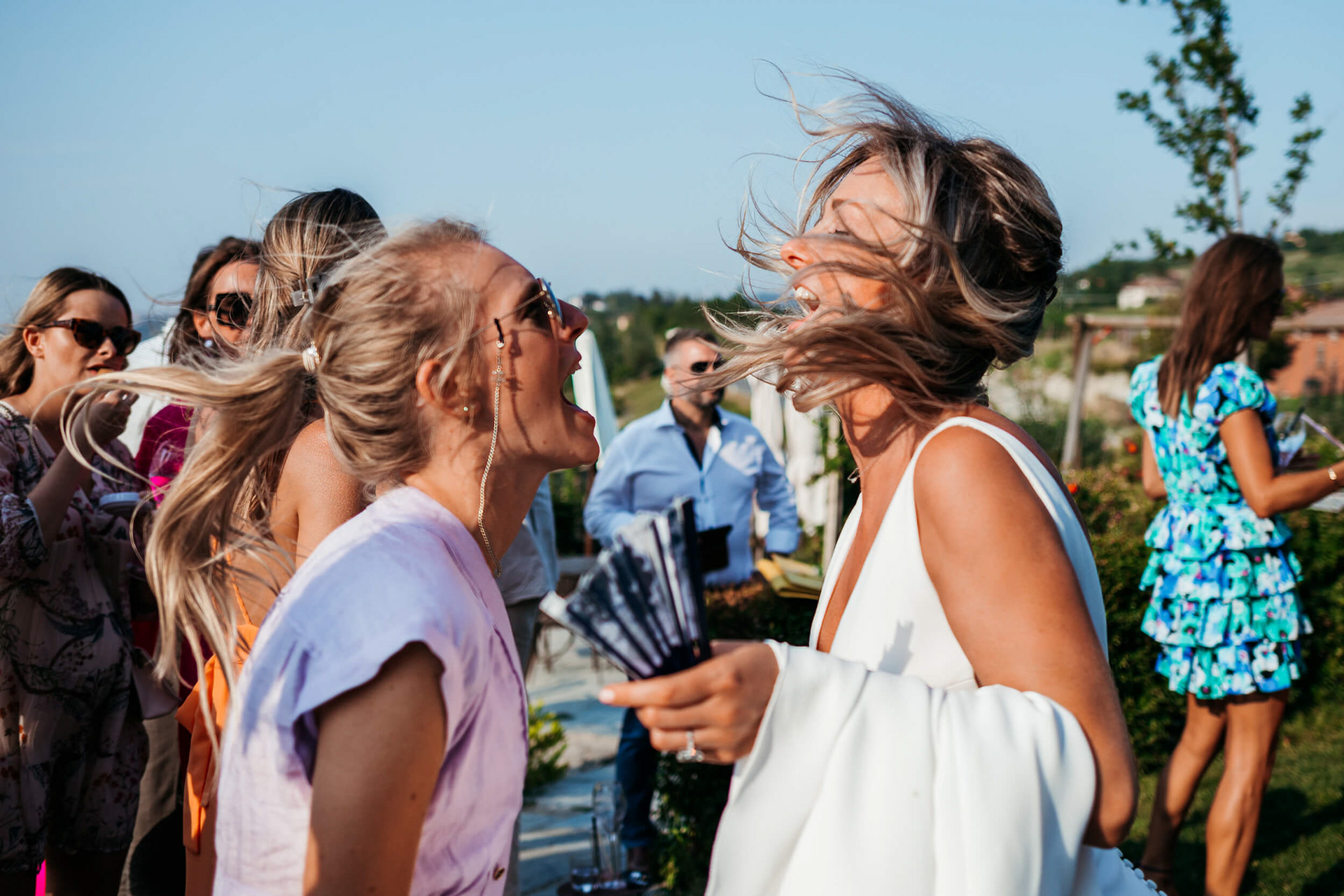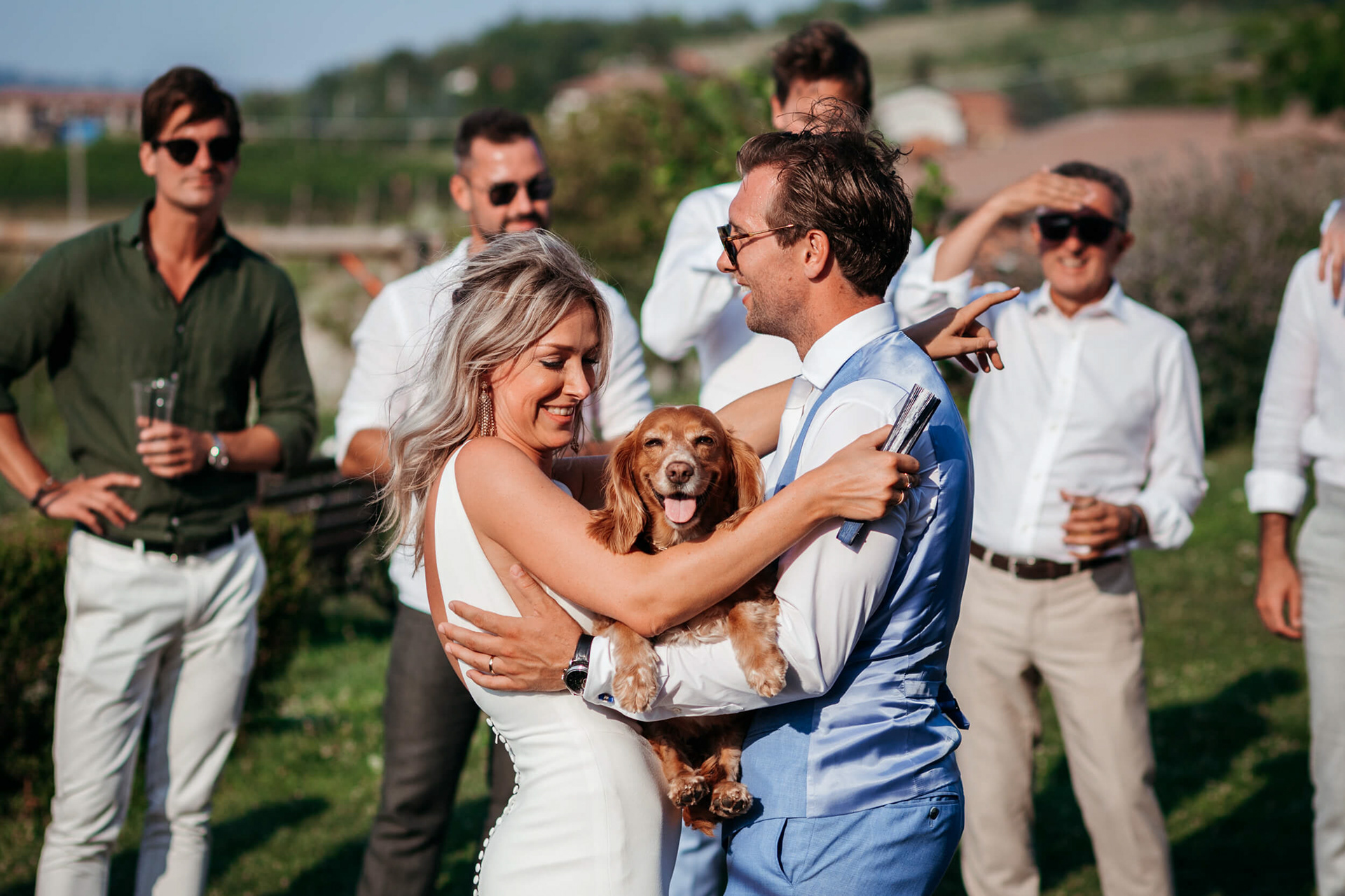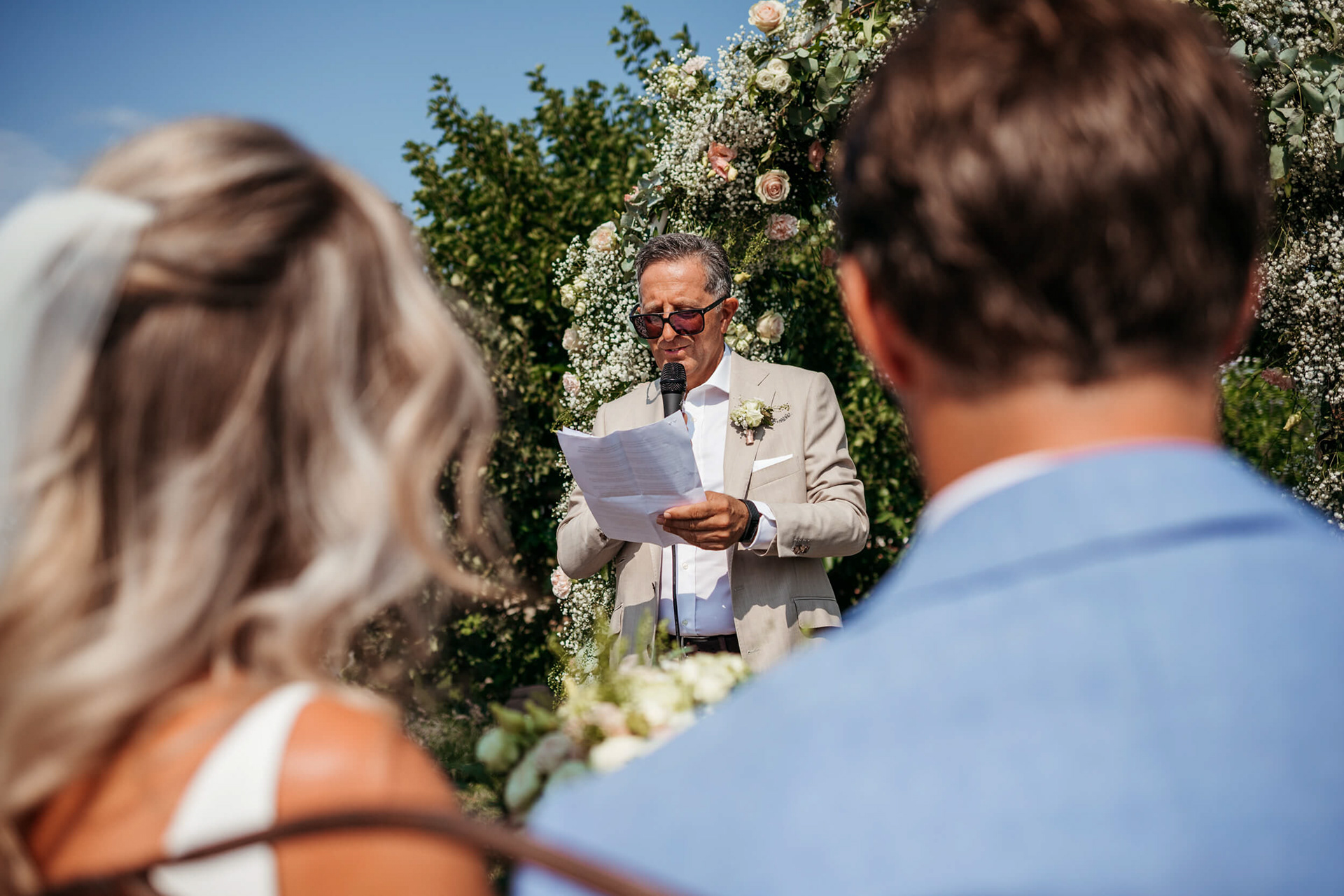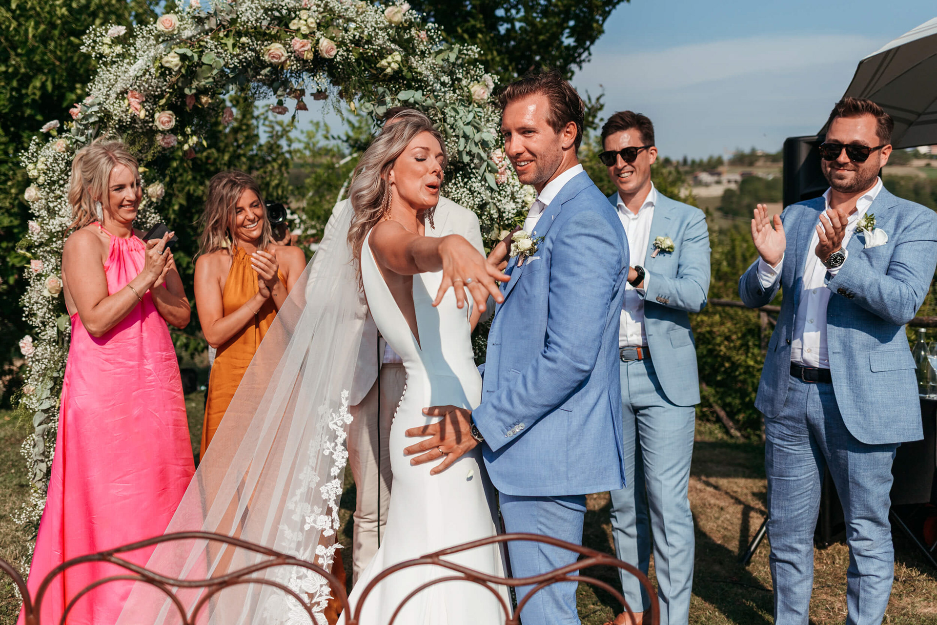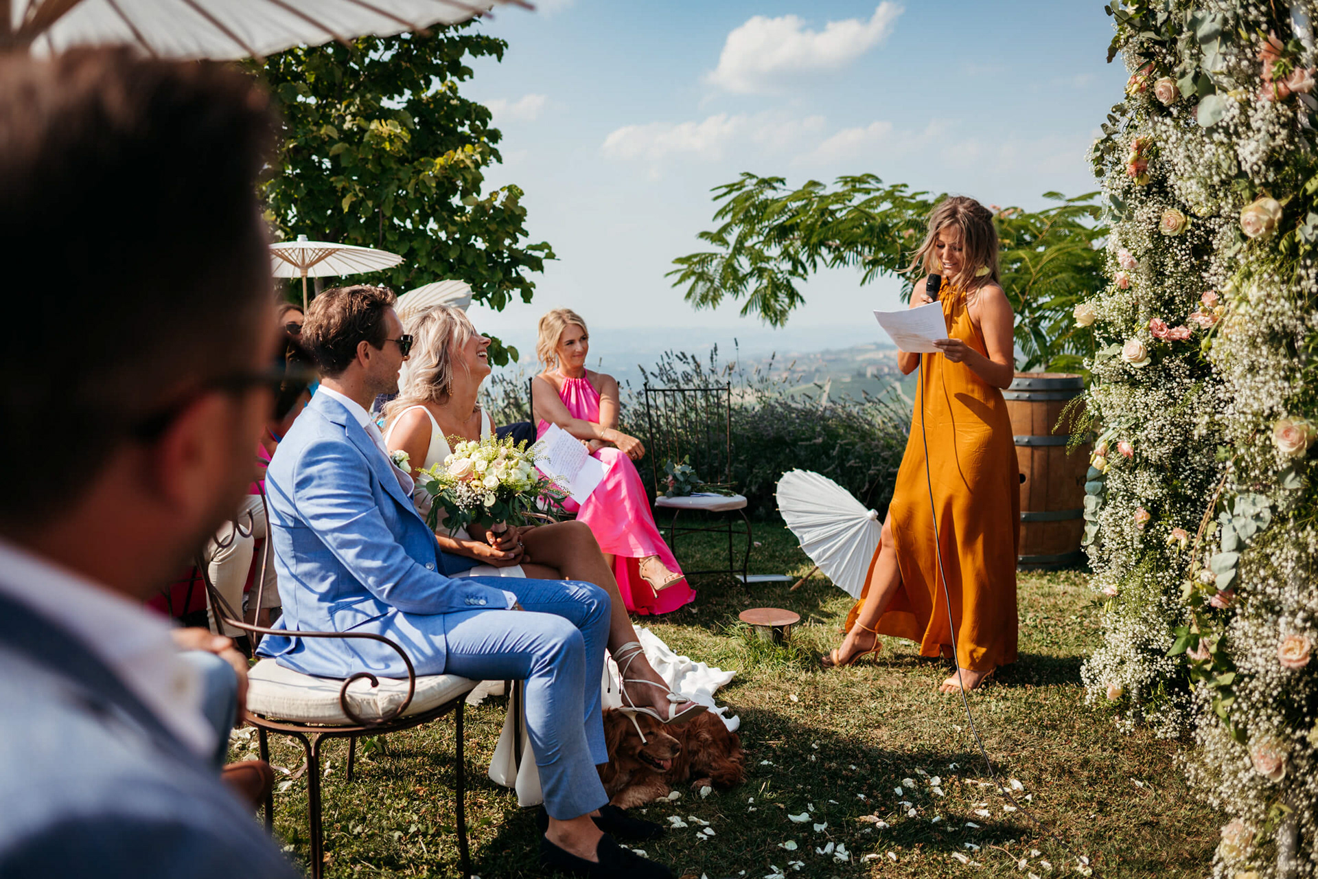 La vista aperta sulle colline, la luce piena e la vicinanza degli invitati hanno reso la cerimonia informale e autentica, vissuta senza rigidità.