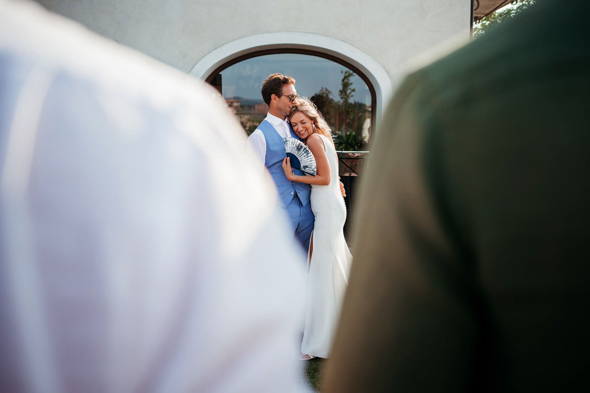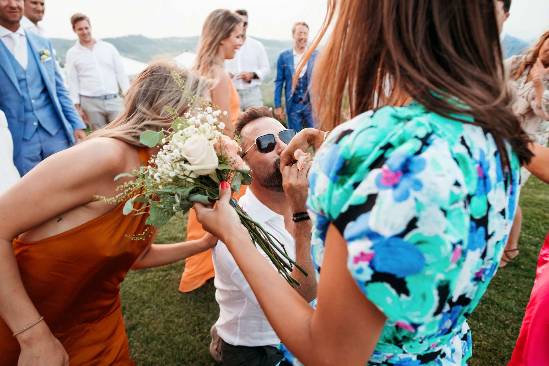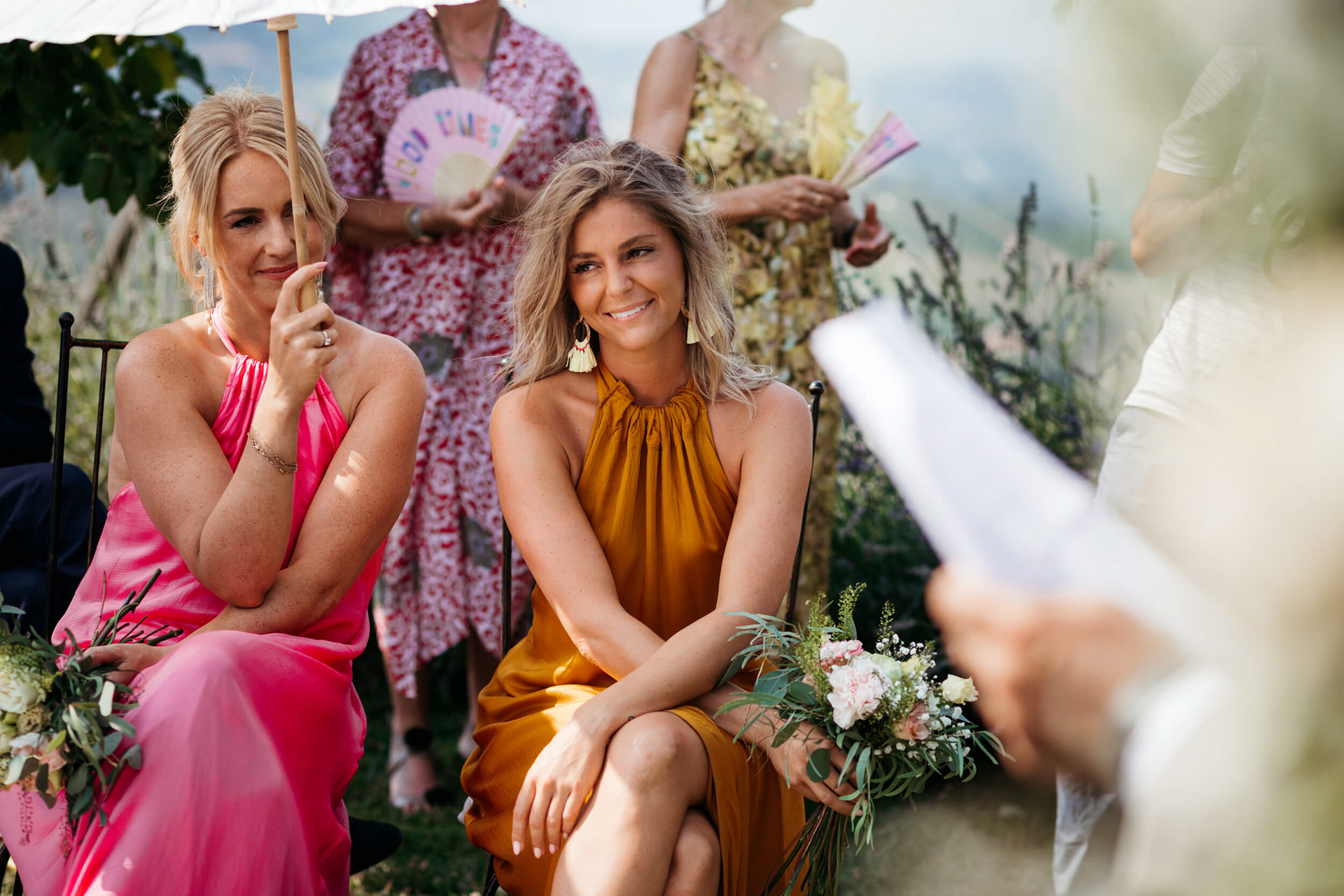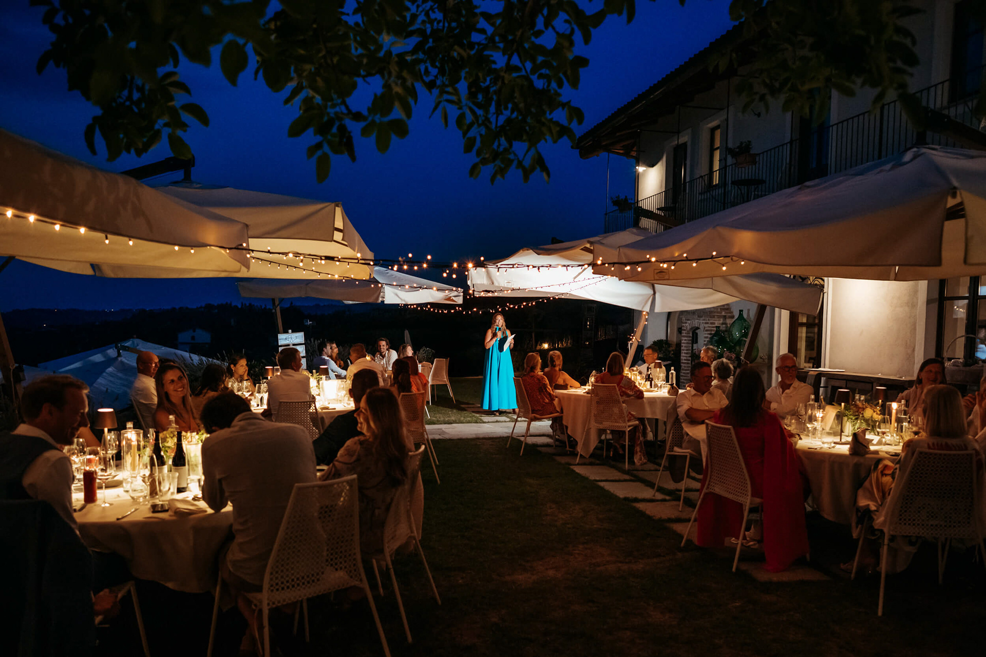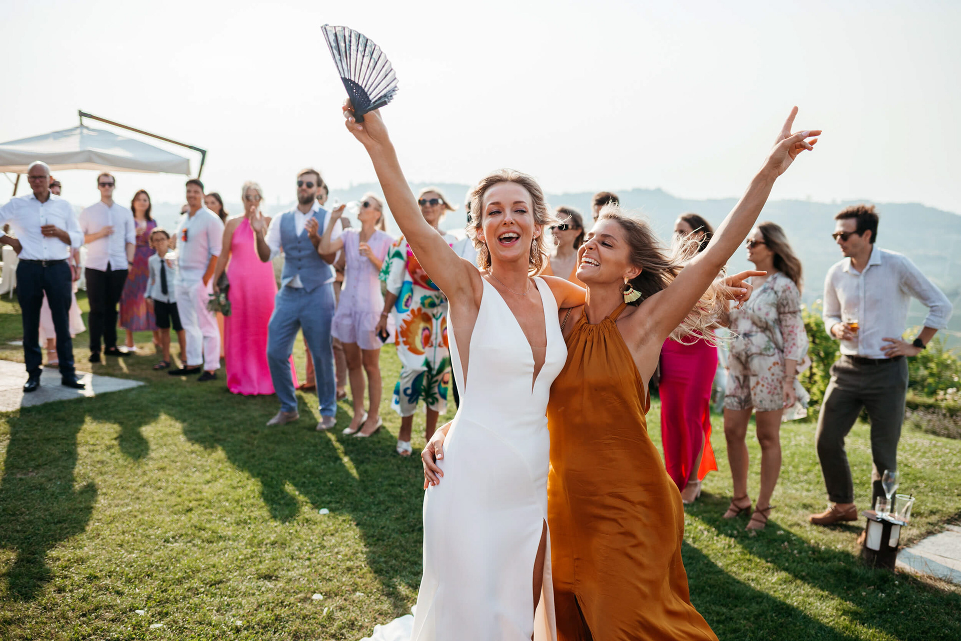 La vista aperta sulle colline, la luce piena e la vicinanza degli invitati hanno reso la cerimonia informale e autentica, vissuta senza rigidità.