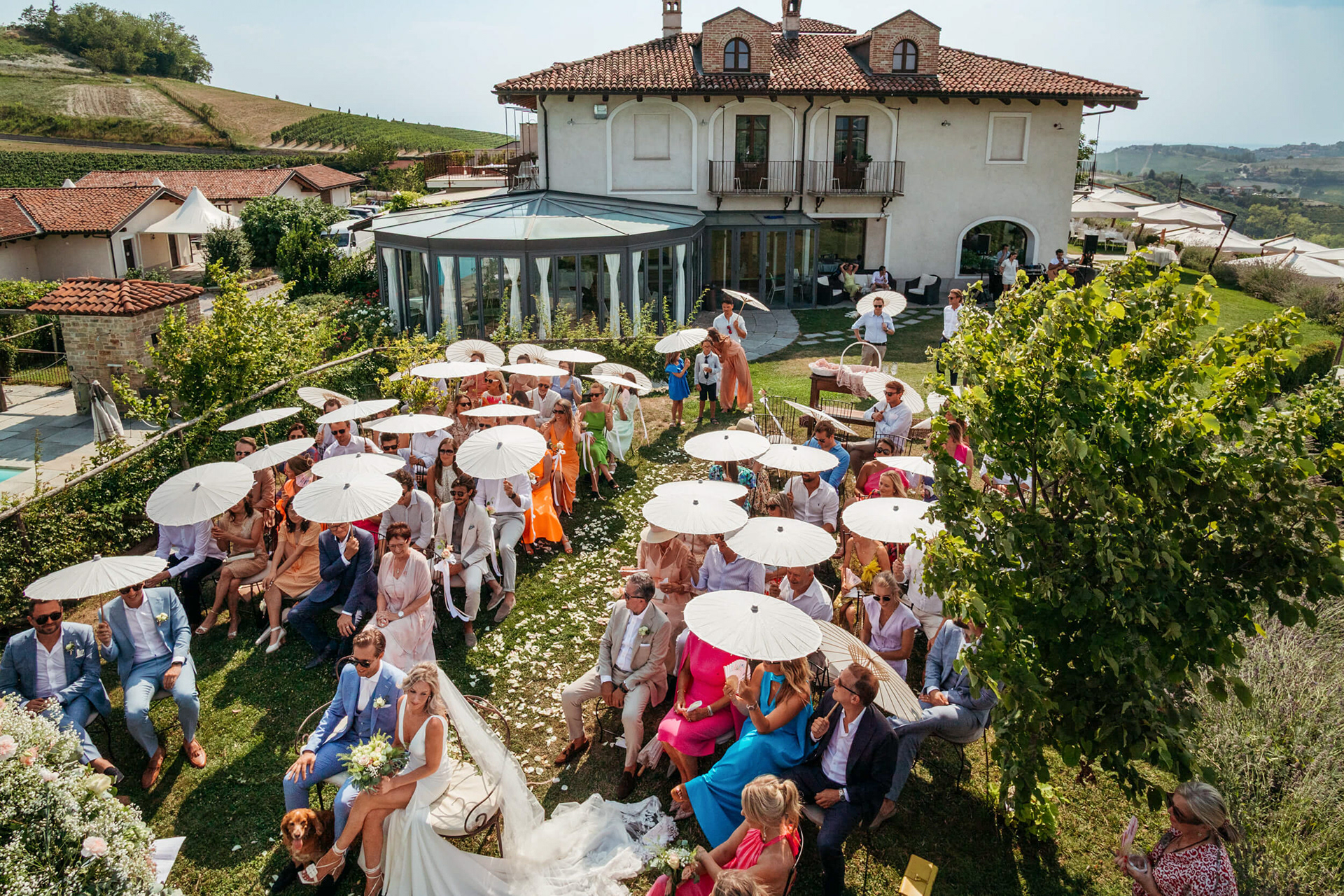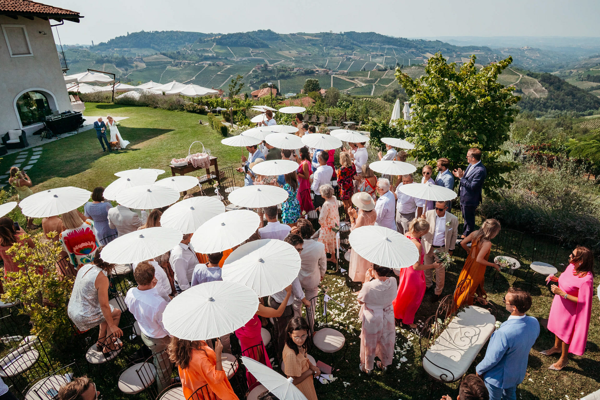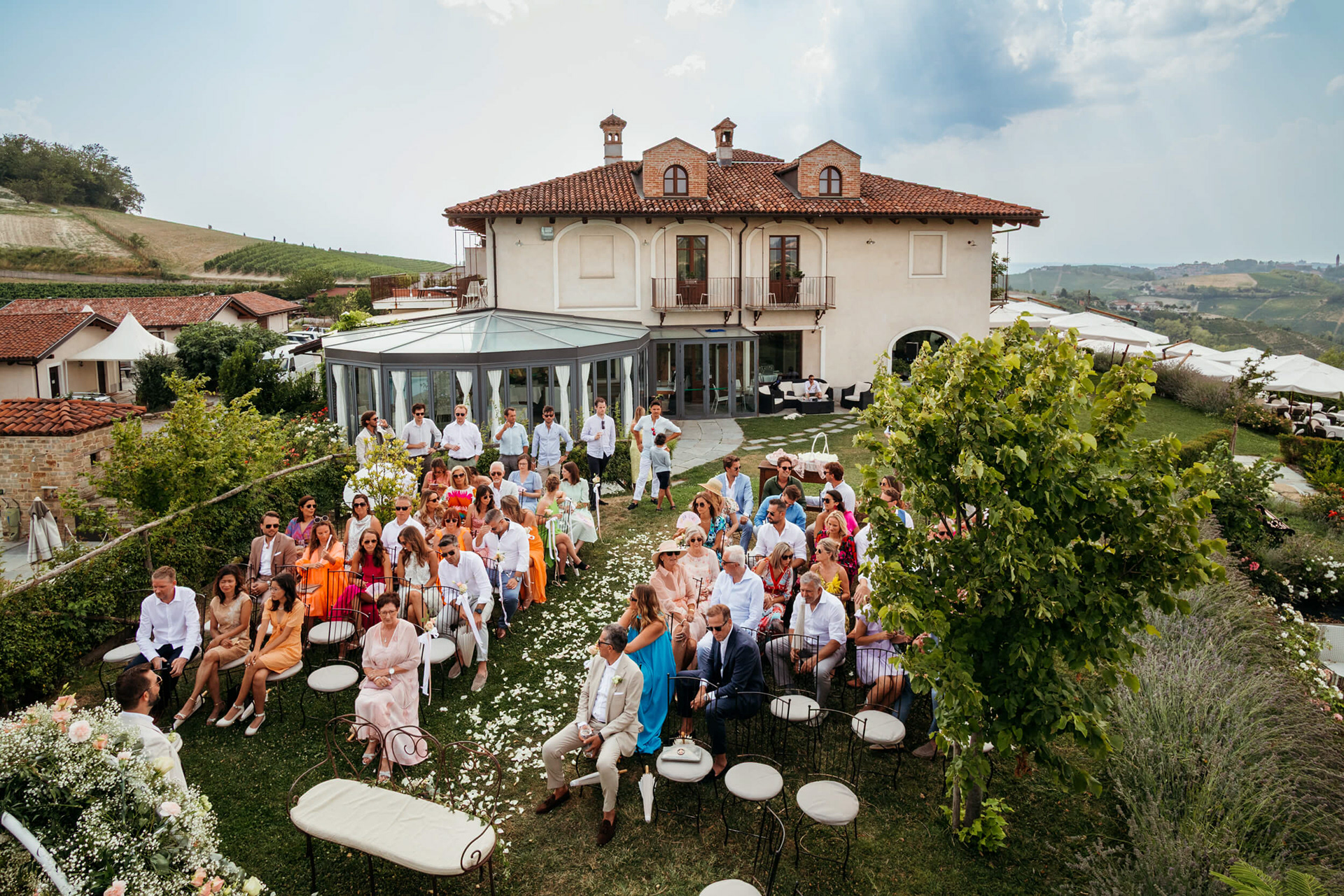 La giornata ha preso forma a La Torricella, affacciata su un panorama ampio e luminoso delle Langhe, che ha fatto da sfondo naturale a un rito semplice e condiviso.