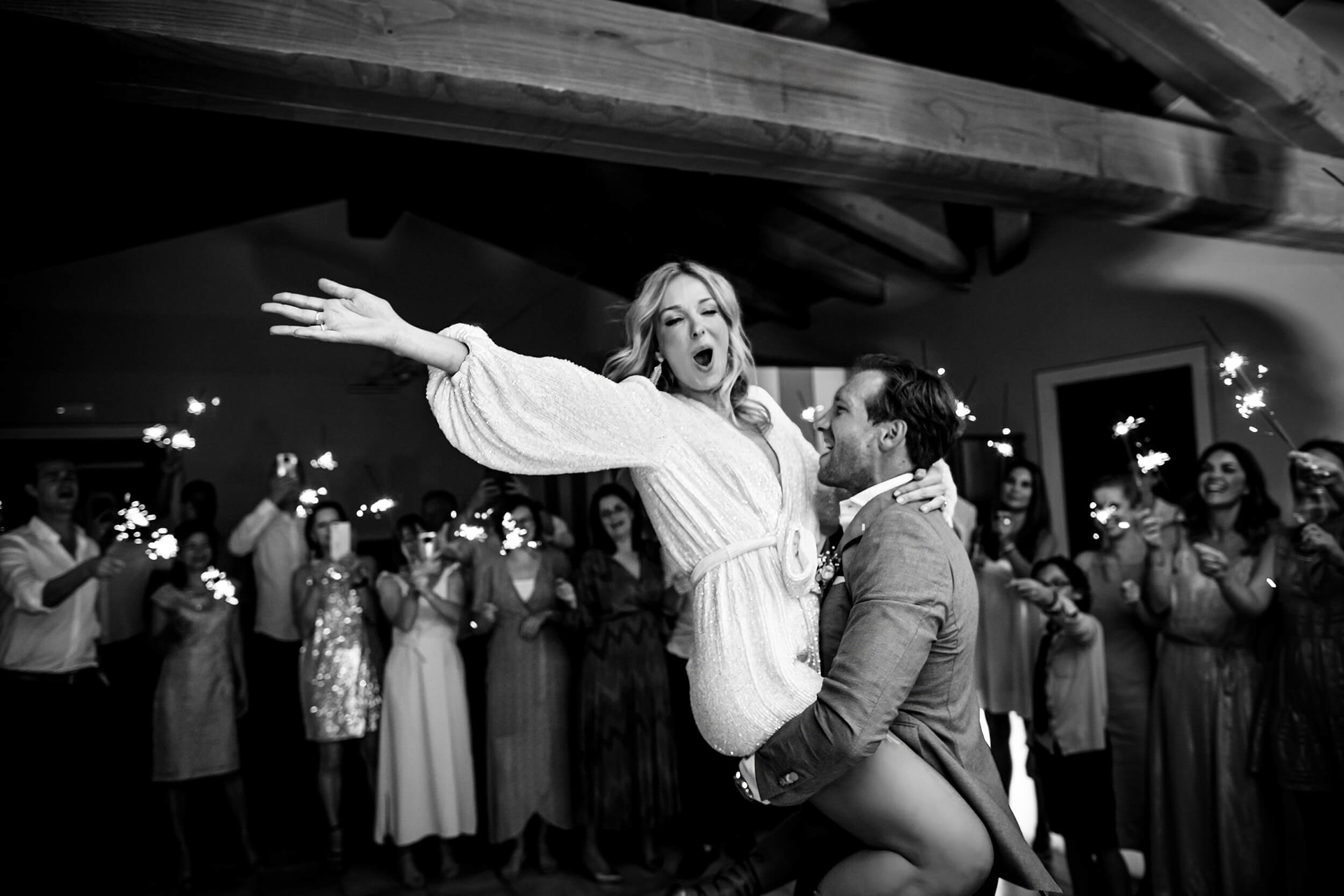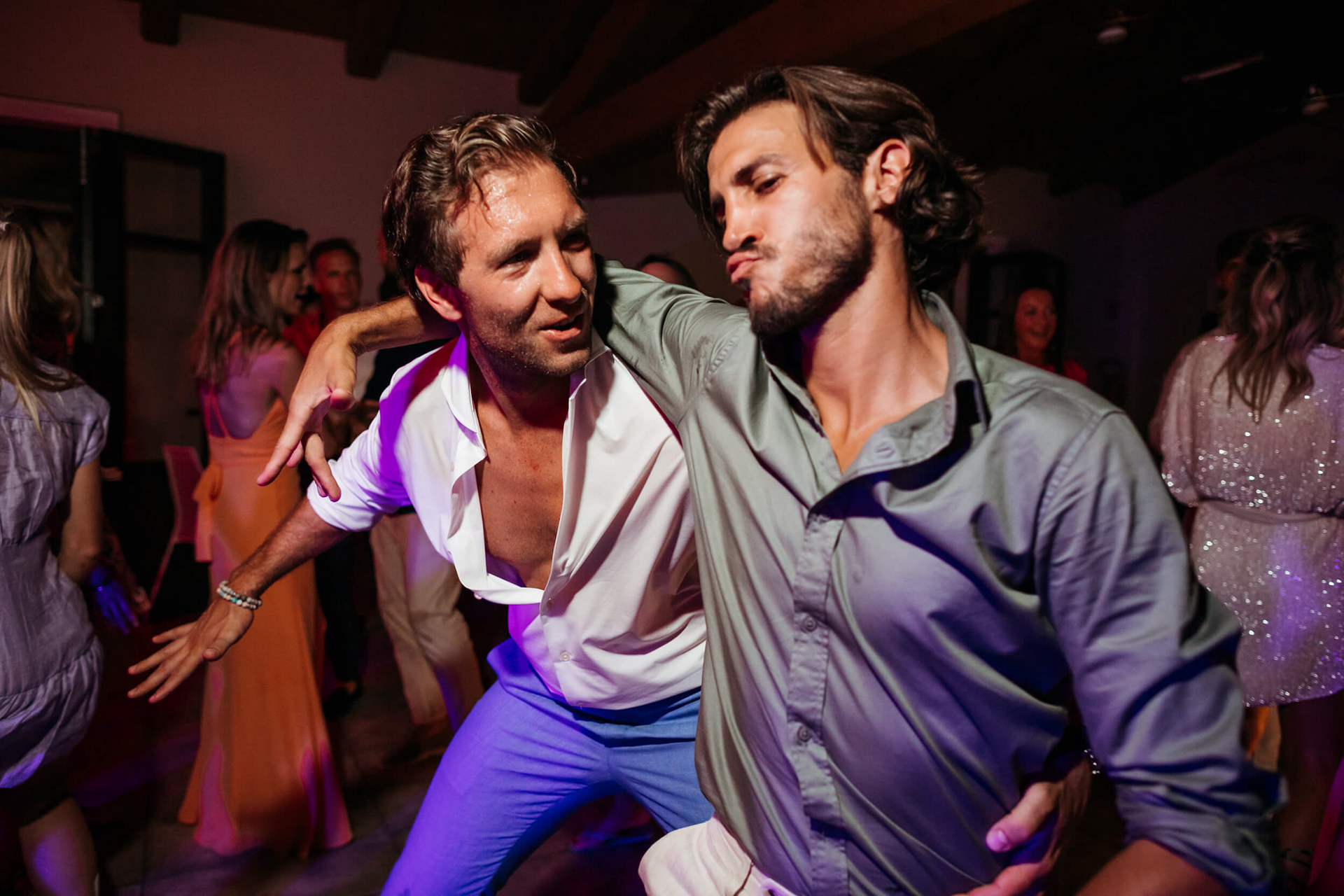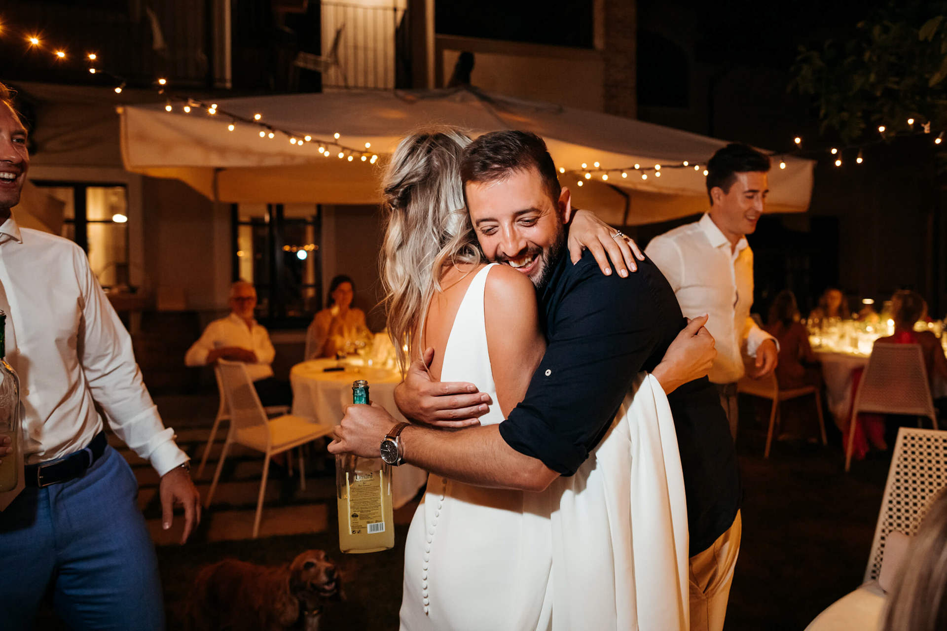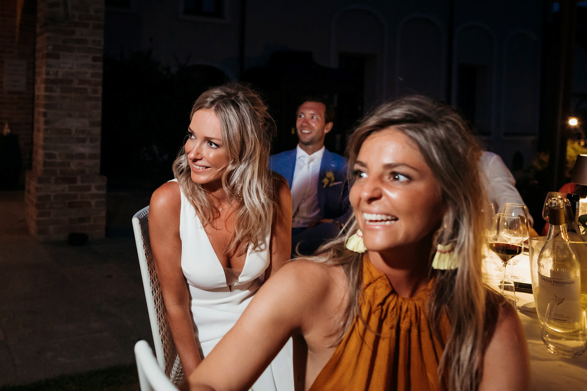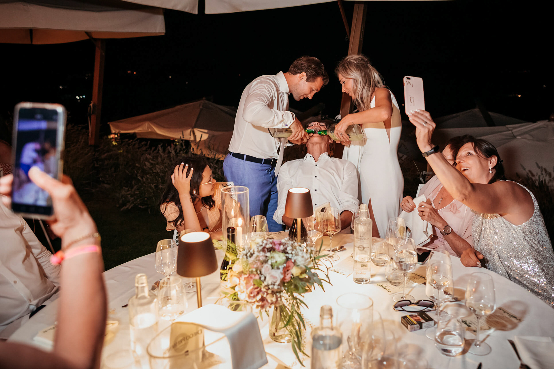Con l’arrivo della sera, la cena ha segnato un cambio di passo: tra brindisi continui e un entusiasmo crescente, l’atmosfera si è trasformata rapidamente in una vera e propria festa, fino a chiudersi in un’esplosione di energia e sorrisi, vissuta senza freni da sposi e invitati.