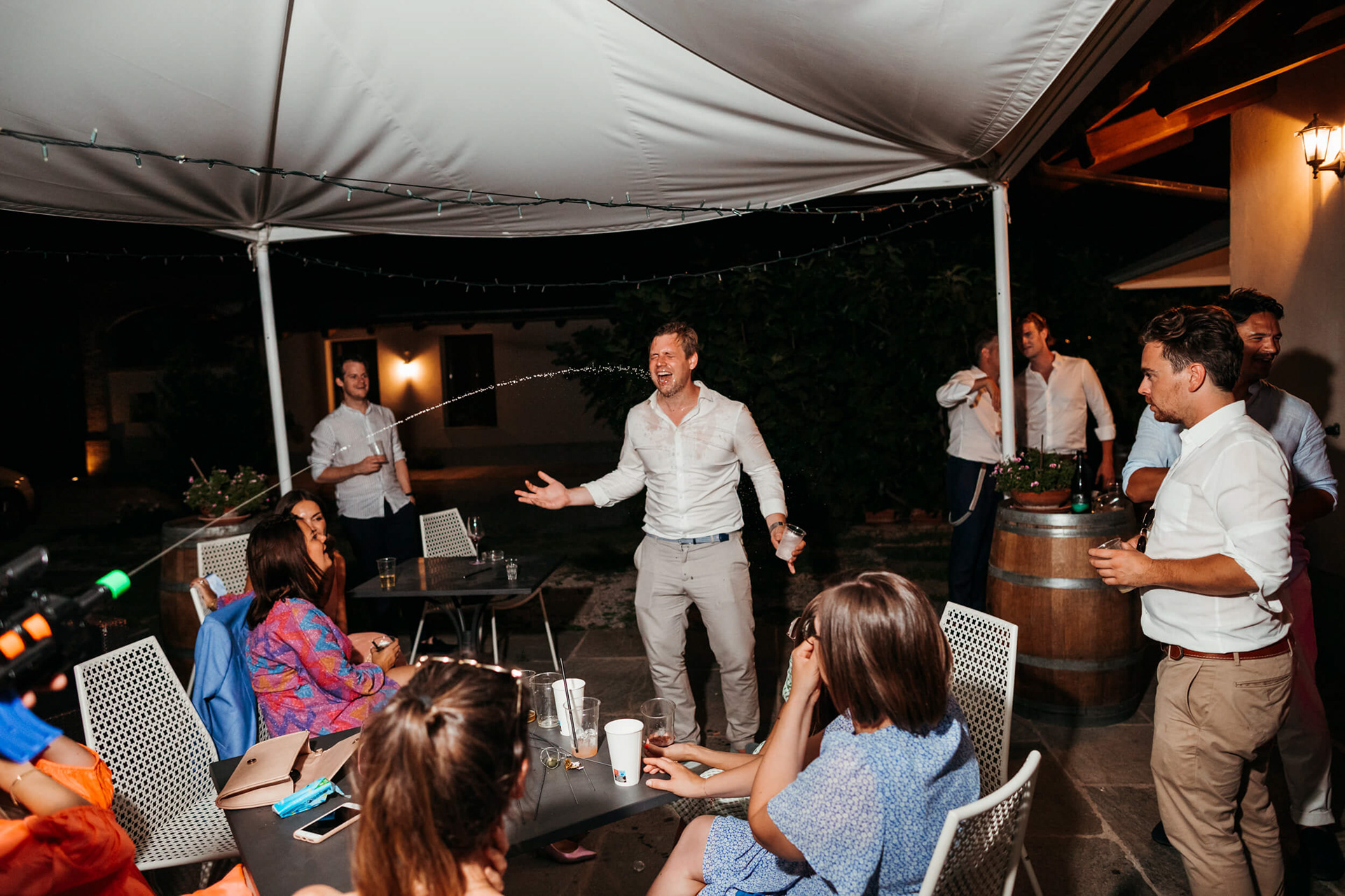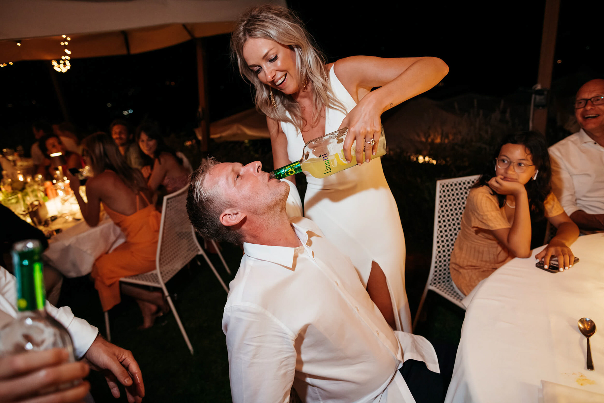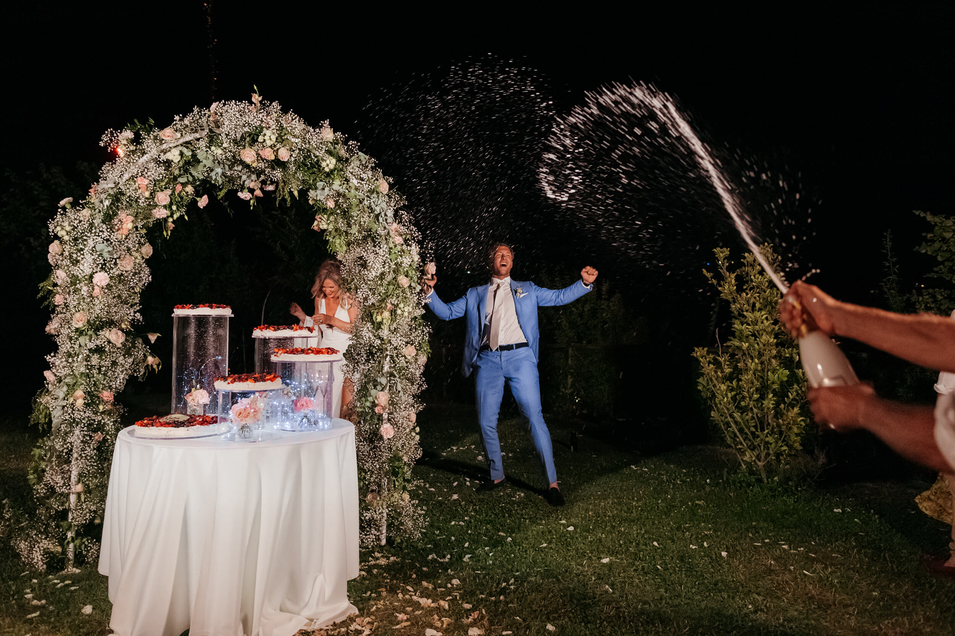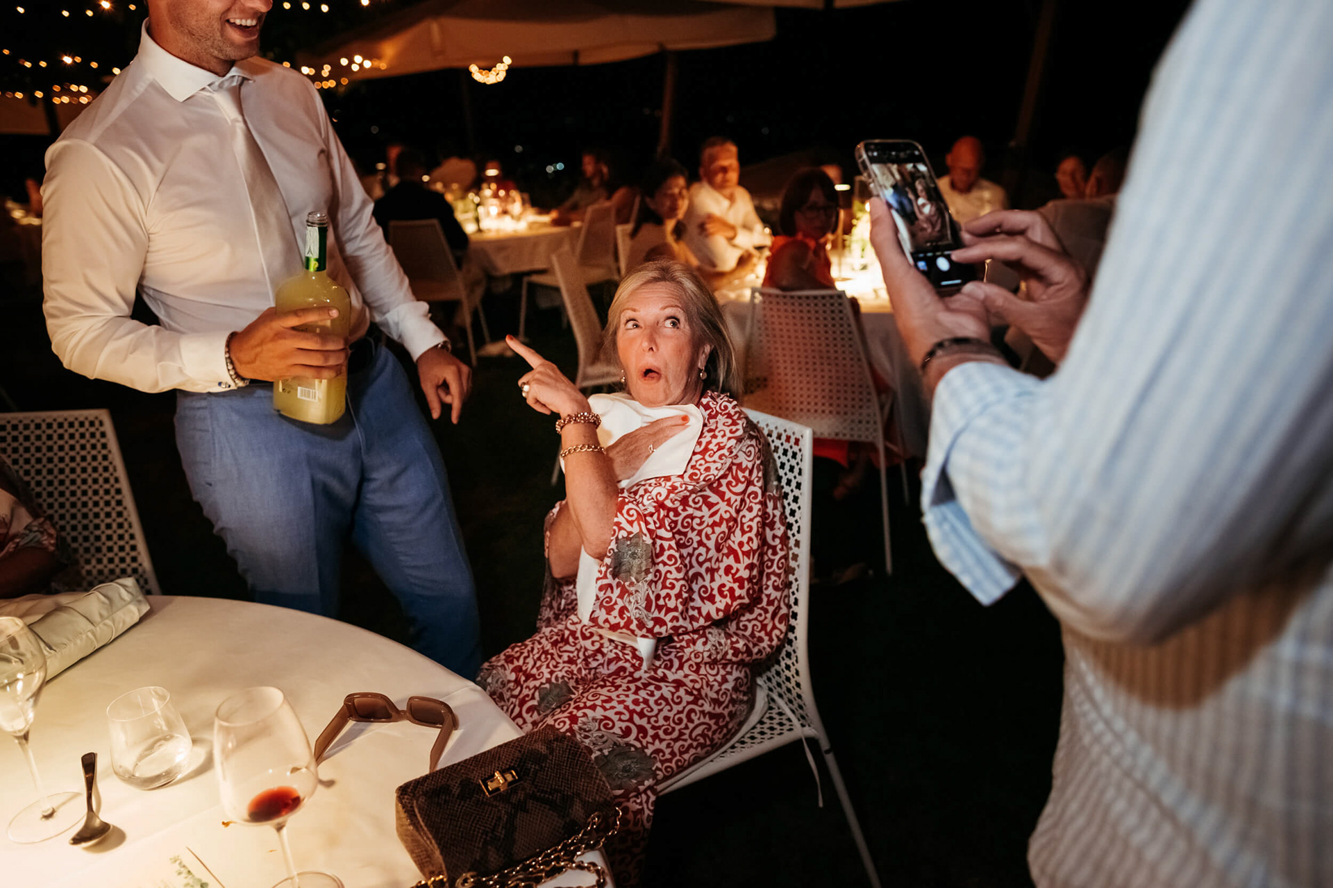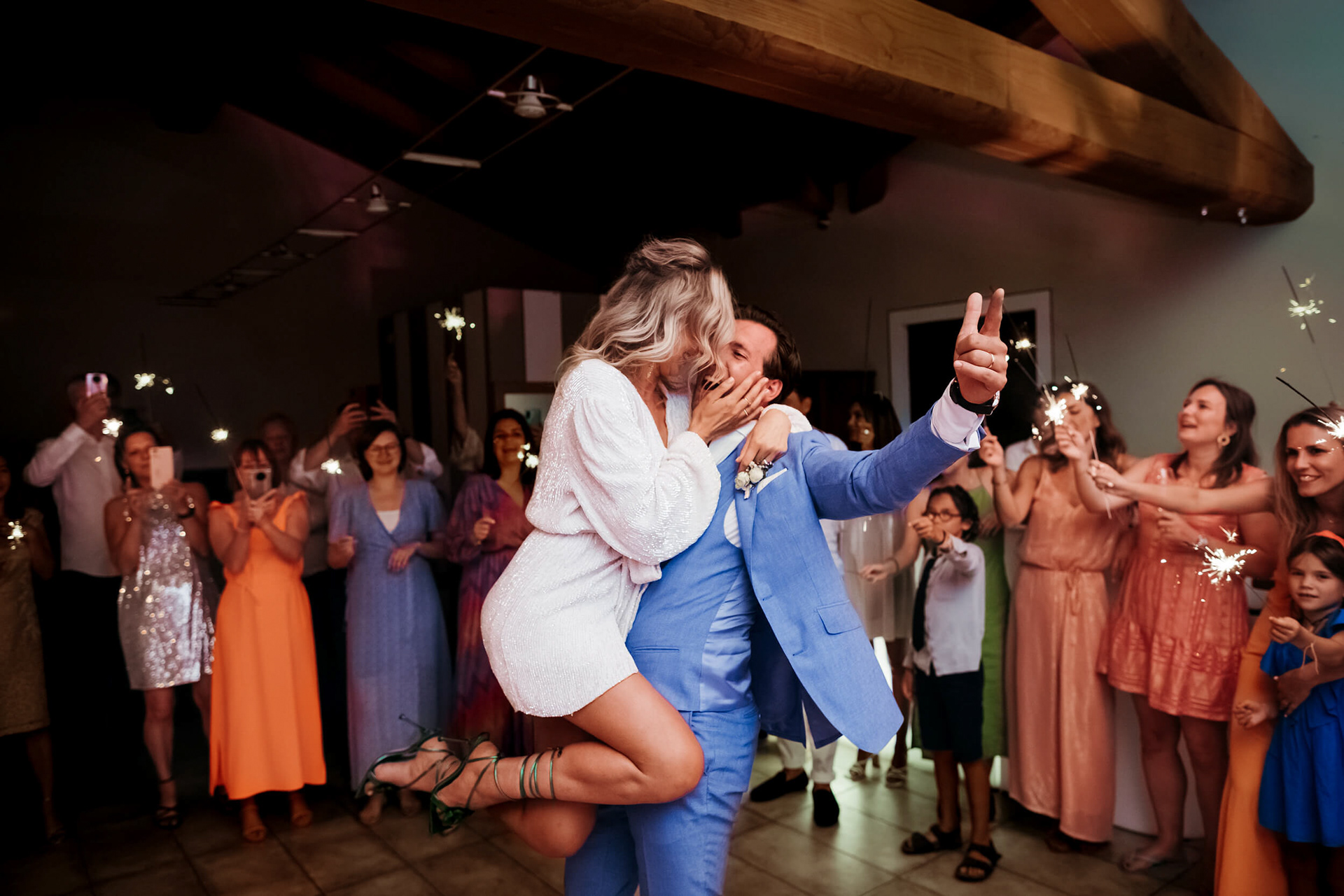 Con l’arrivo della sera, la cena ha segnato un cambio di passo: tra brindisi continui e un entusiasmo crescente, l’atmosfera si è trasformata rapidamente in una vera e propria festa, fino a chiudersi in un’esplosione di energia e sorrisi, vissuta senza freni da sposi e invitati.
