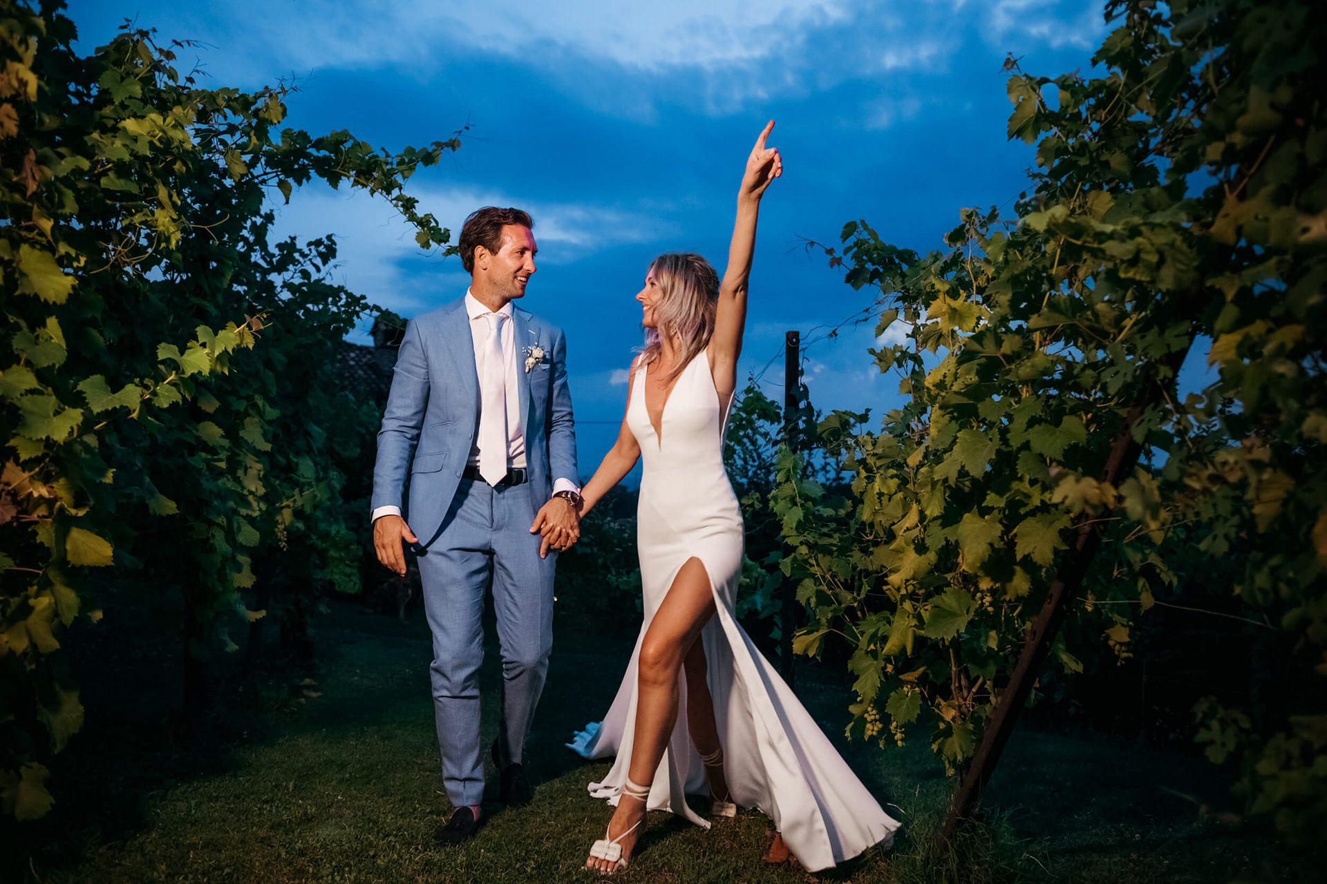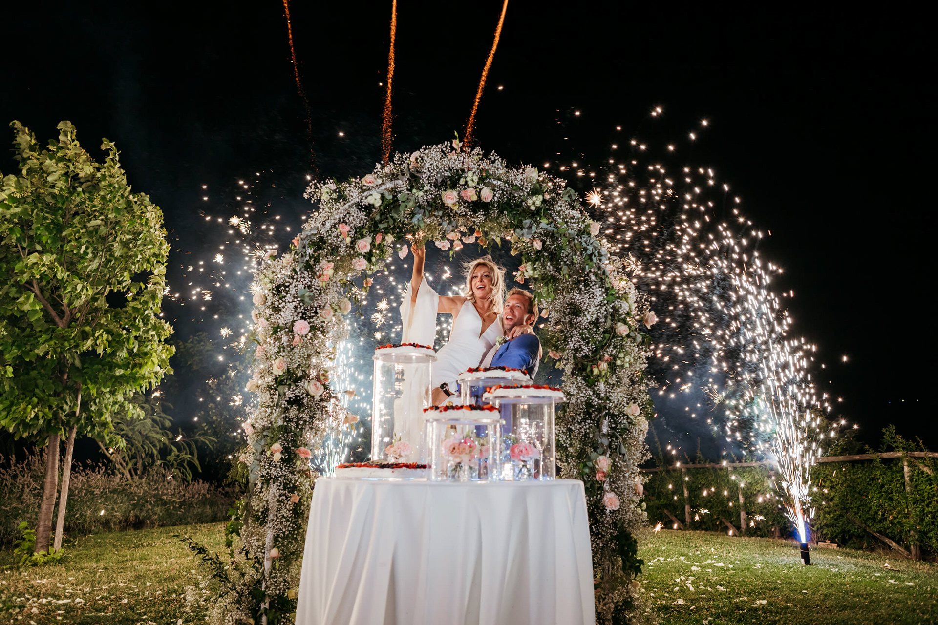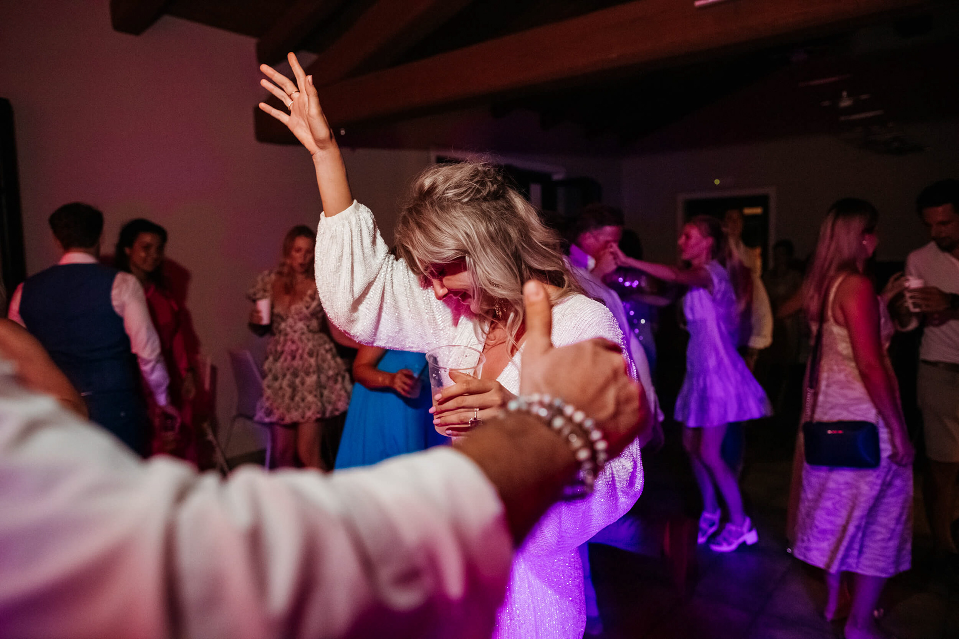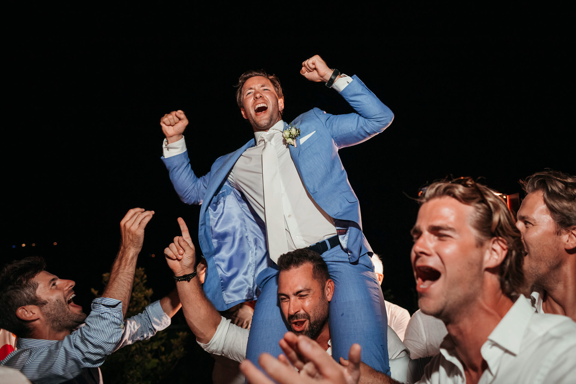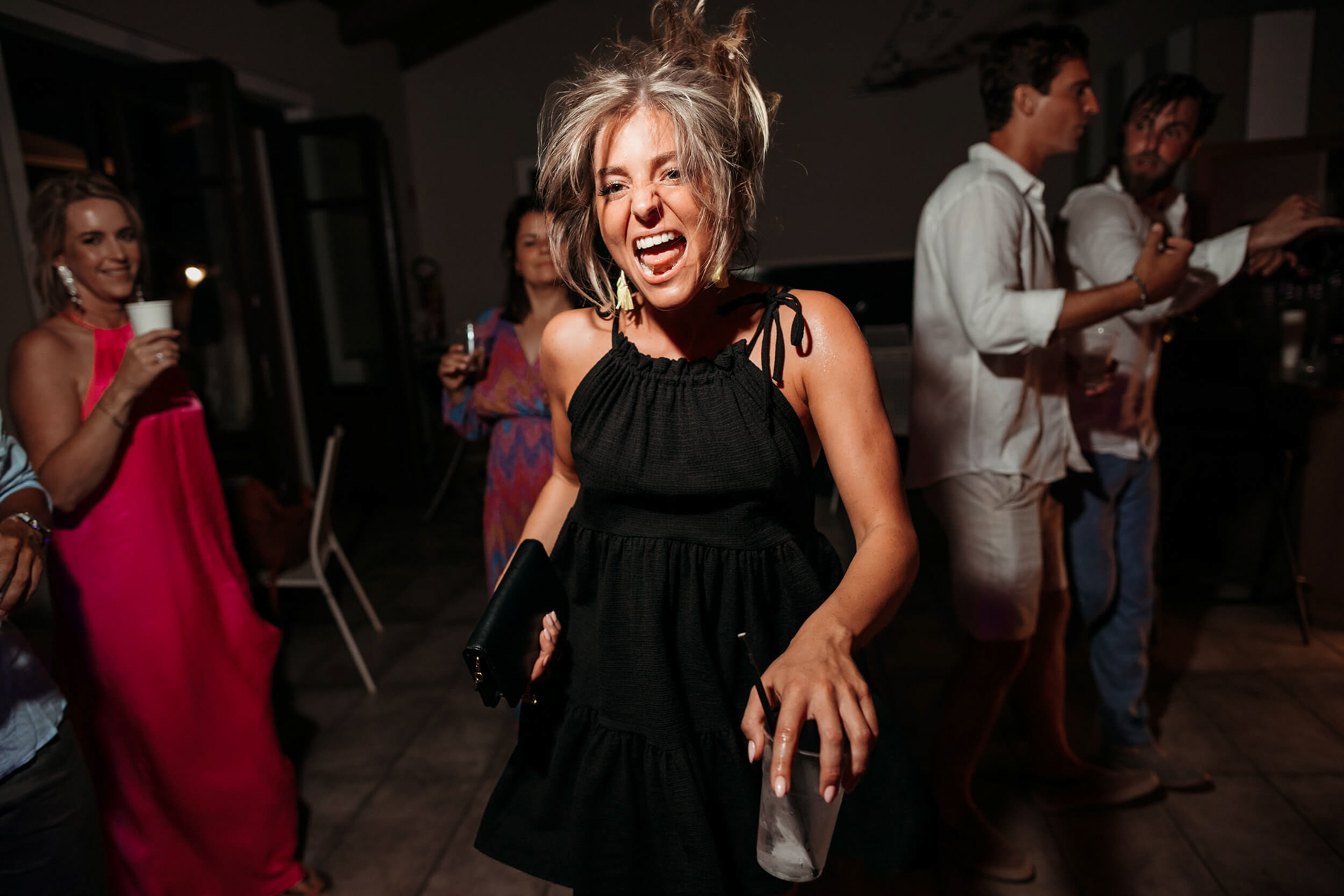 Con l’arrivo della sera, la cena ha segnato un cambio di passo: tra brindisi continui e un entusiasmo crescente, l’atmosfera si è trasformata rapidamente in una vera e propria festa, fino a chiudersi in un’esplosione di energia e sorrisi, vissuta senza freni da sposi e invitati.