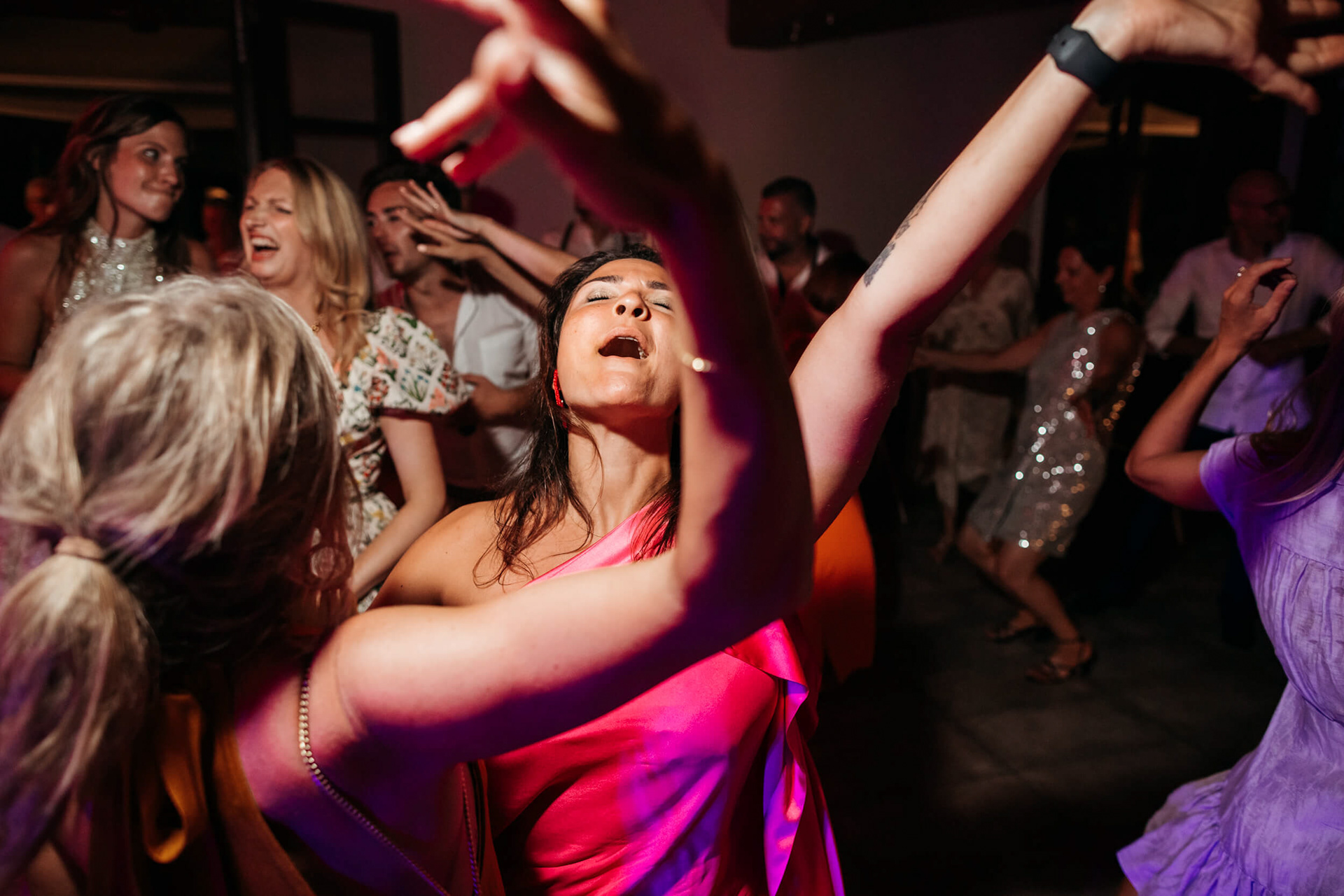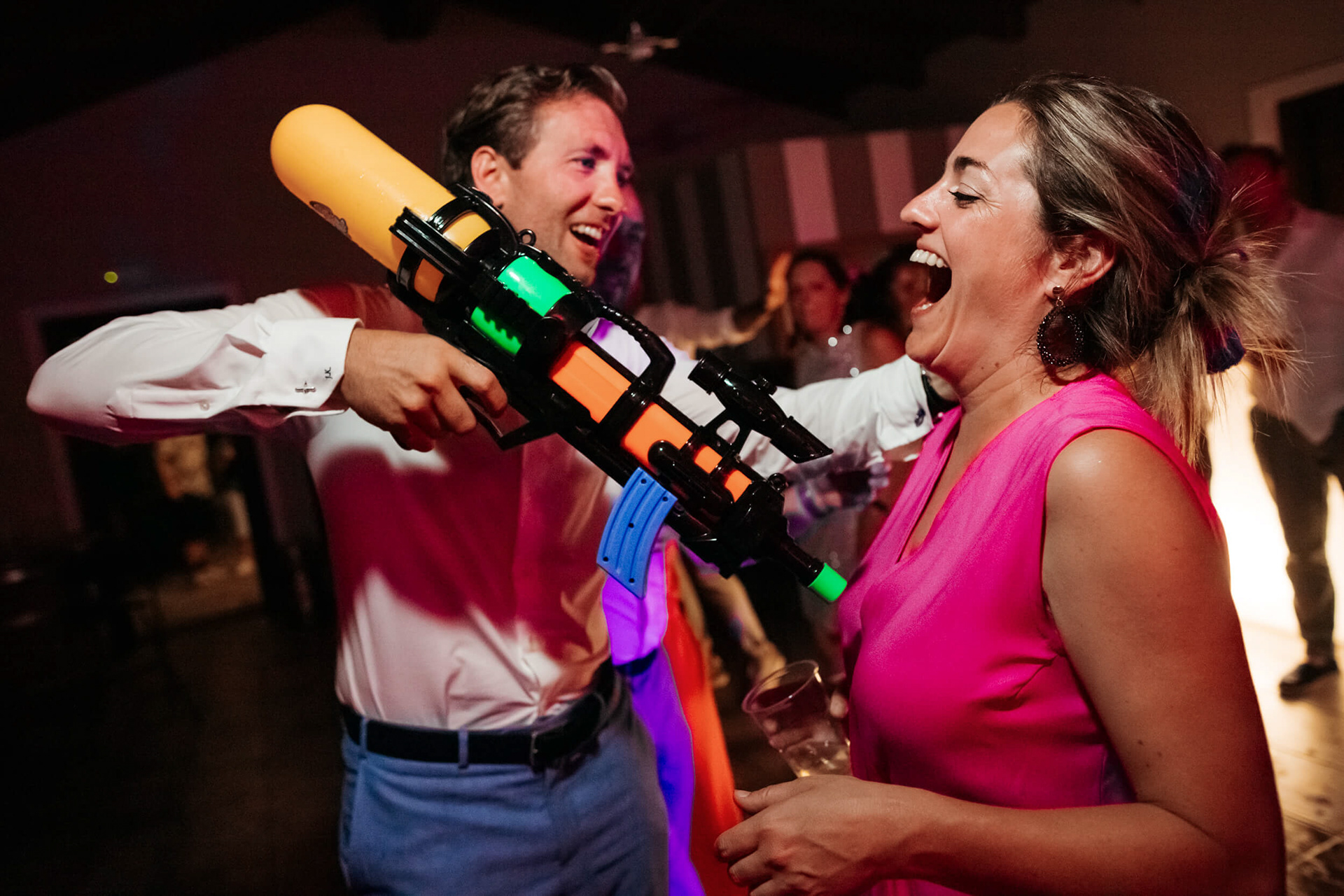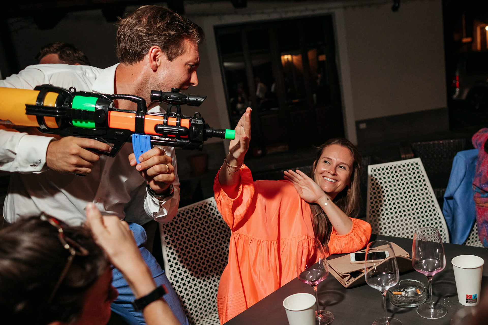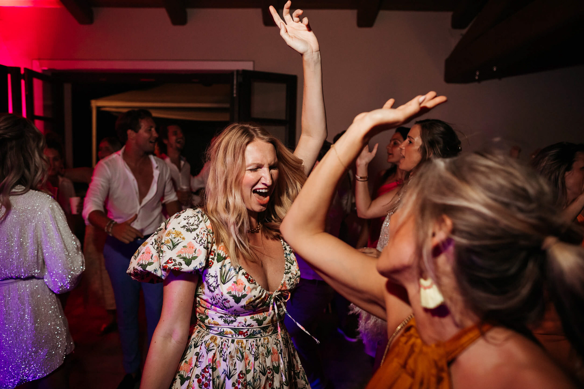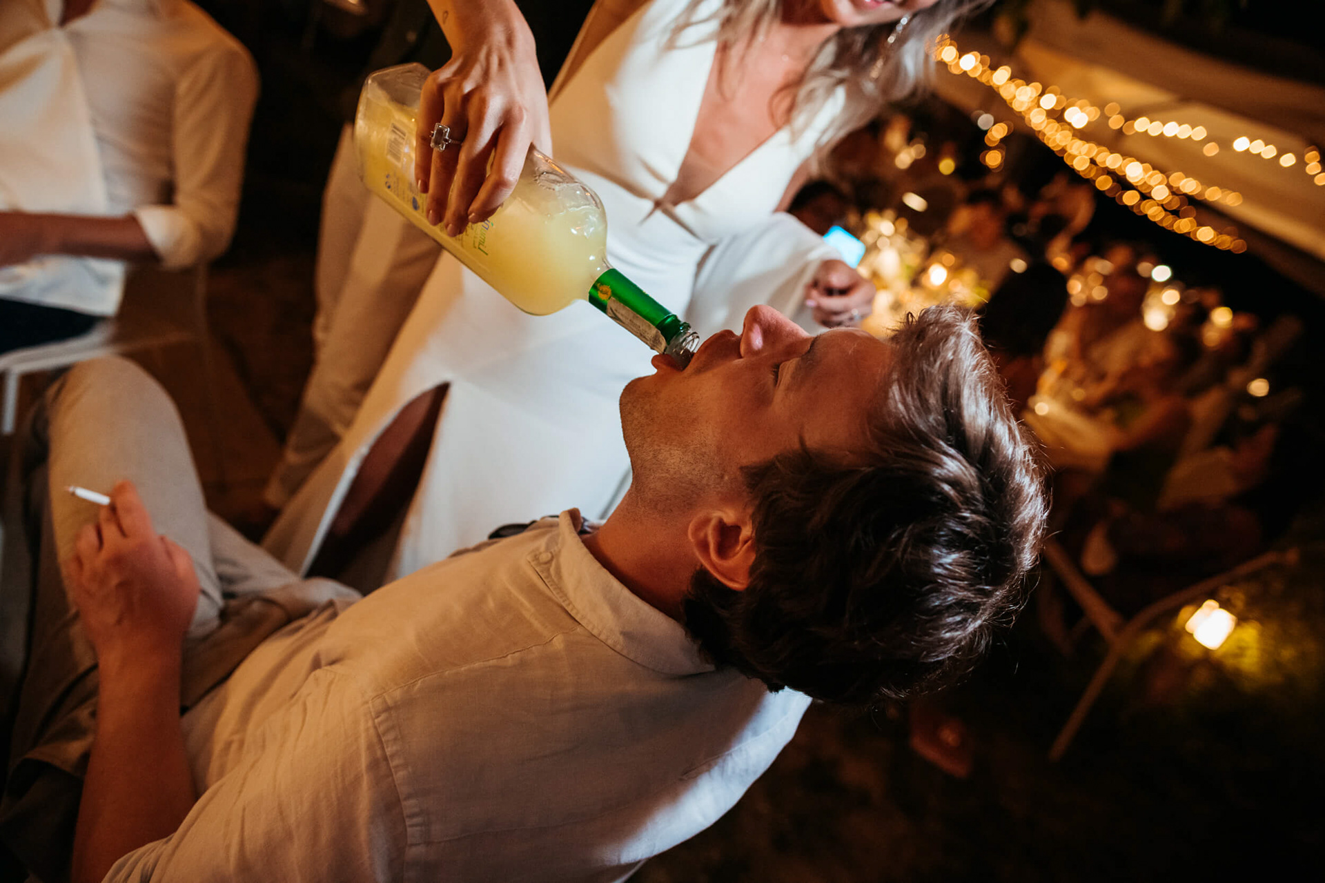 Con l’arrivo della sera, la cena ha segnato un cambio di passo: tra brindisi continui e un entusiasmo crescente, l’atmosfera si è trasformata rapidamente in una vera e propria festa, fino a chiudersi in un’esplosione di energia e sorrisi, vissuta senza freni da sposi e invitati.