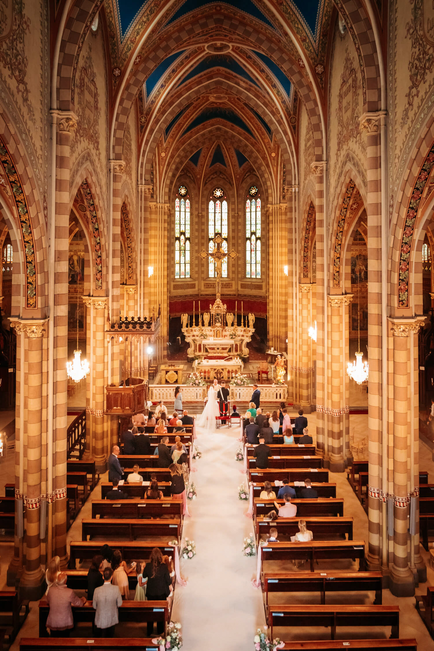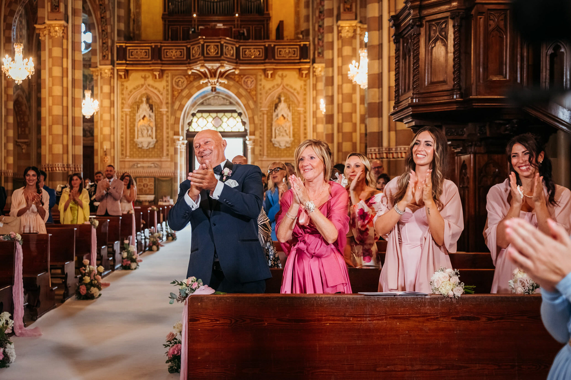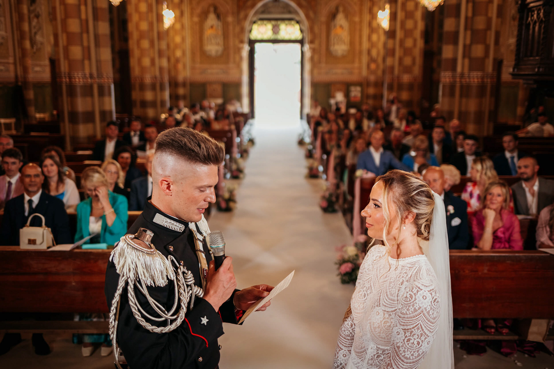 Per la cerimonia, gli sposi si sono spostati alla Chiesa della Madonna della Neve, a Monforte d'Alba, una chiesa imponente e di grande verticalità, che ha dato al momento un tono solenne e intensamente vissuto.